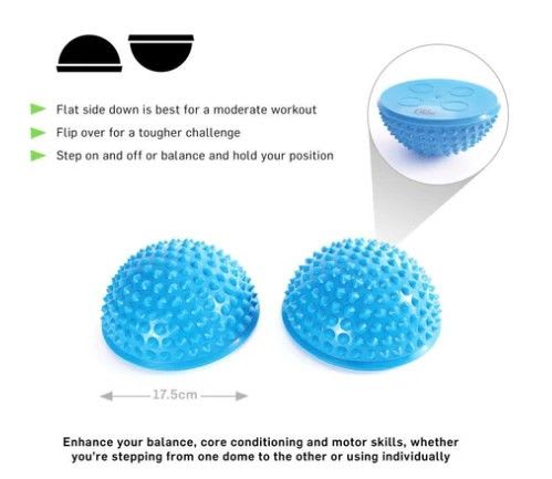 Each dome has a flat easy grip side and a textured ‘spiky’ side. Use them individually or together flat side down for a moderate workout and then simply flip over onto the pebbled ‘spiky’ side for a more difficult challenge.