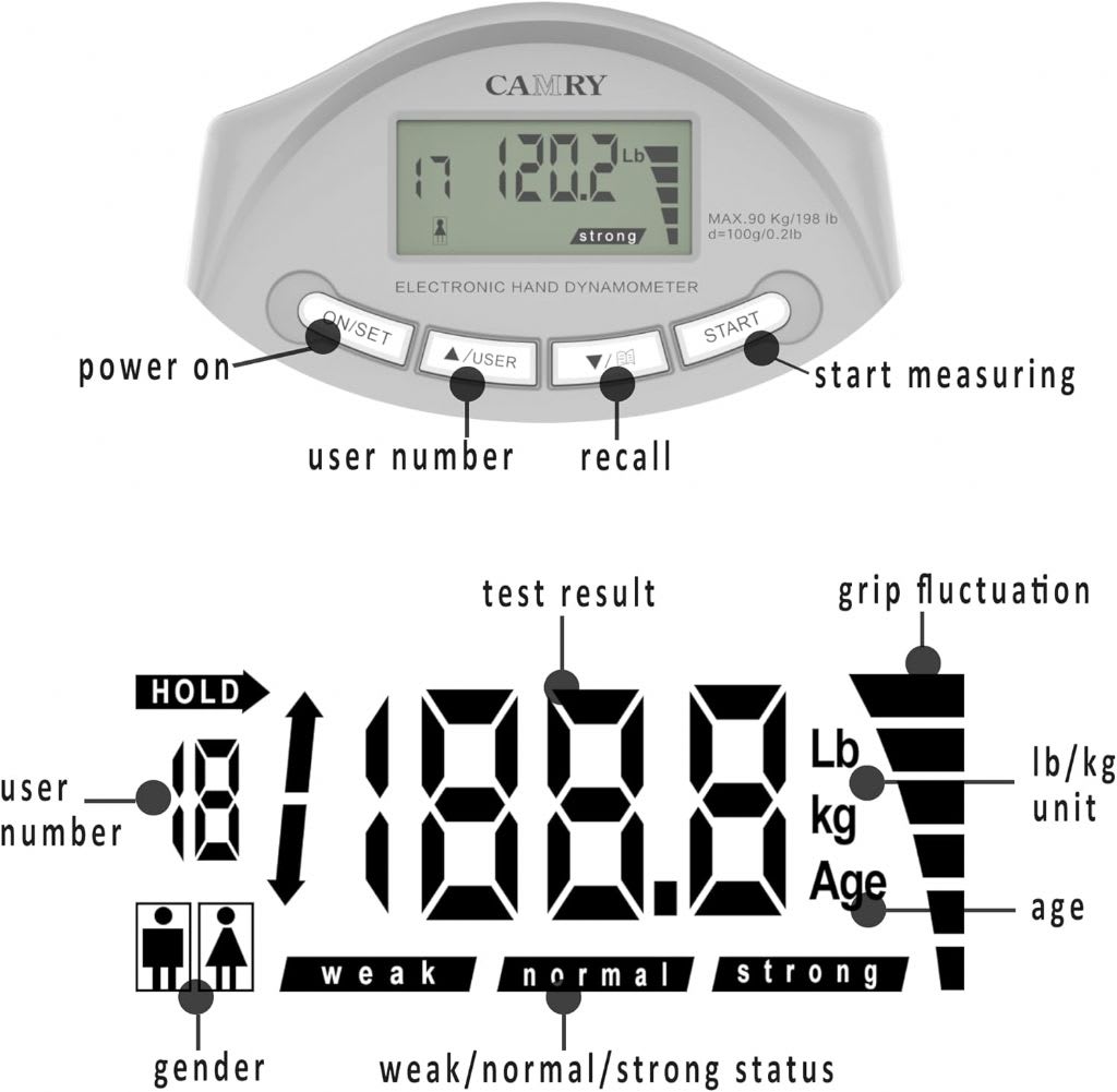 USER FRIENDLY - Squeeze the hand dynamometer with maximum isometric effort for at least 5 seconds. After testing, the LCD will automatically display the maximum grip value and a grip value status bar showing the status of “weak”, “normal” or “strong” according to age and gender preset for each test.