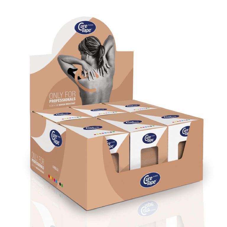 Six (6) individually packed rolls (with package s) in a six unit display pack. CureTape® Beige roll is registered as a Class I Medical device with EU registration number NL/CA01/04-07434. With the standard elastic therapeutic wave design, CureTape® is essential tool for clinics specialising in the use of neuromuscular techniques.