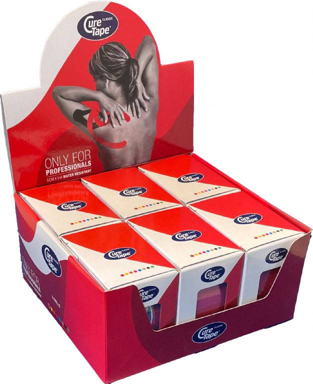 Six (6) individually packed red rolls (with package s) in a six unit display pack. CureTape® Red roll is registered as a Class I Medical device with EU registration number NL/CA01/04-07434. With the standard elastic therapeutic wave design, CureTape® is essential tool for clinics specialising in the use of neuromuscular techniques.