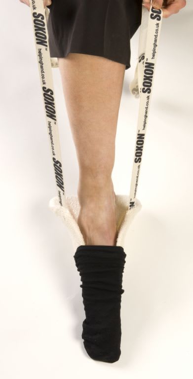 Simple and inexpensive dressing aid, the Foxy wide sock aid is a useful gadget to put socks or stockings on especially if bending or reaching your foot is difficult. The long cotton tapes make it easy to use from a seated position, thus reducing the need to bend at the hip or knee especially post surgery.