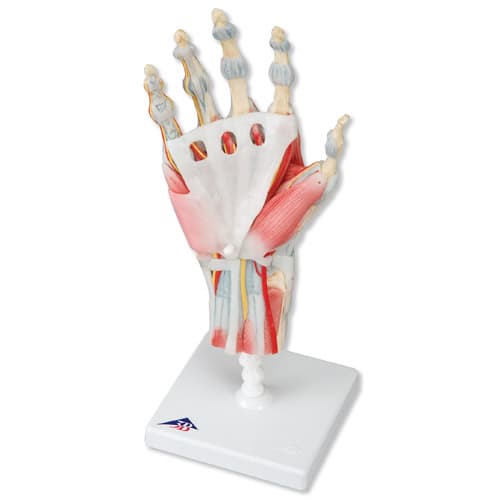 The bones, muscles, tendons, ligaments, nerves, arteries, and veins are all featured in this high quality 4 part model of the hand and lower forearm. The dorsal side of the hand shows the extensor muscles as well as portions of the tendons at the wrist as they pass under the extensor retunaculum. The palmar face of the hand is represented in three layers, the first two are removable to allow detailed study of the deeper anatomical layer of the hand. In addition clinically important structures such as the median nerve and superficial palmar arterial arch can be explored in detail in the hand model. The deepest anatomical layer allows for study of the intrinsic muscles and deep palmar arterial arch in addition to other details of the anatomy of the hand. This high quality anatomically correct hand model with ligaments and muscles is great for detailed study.
