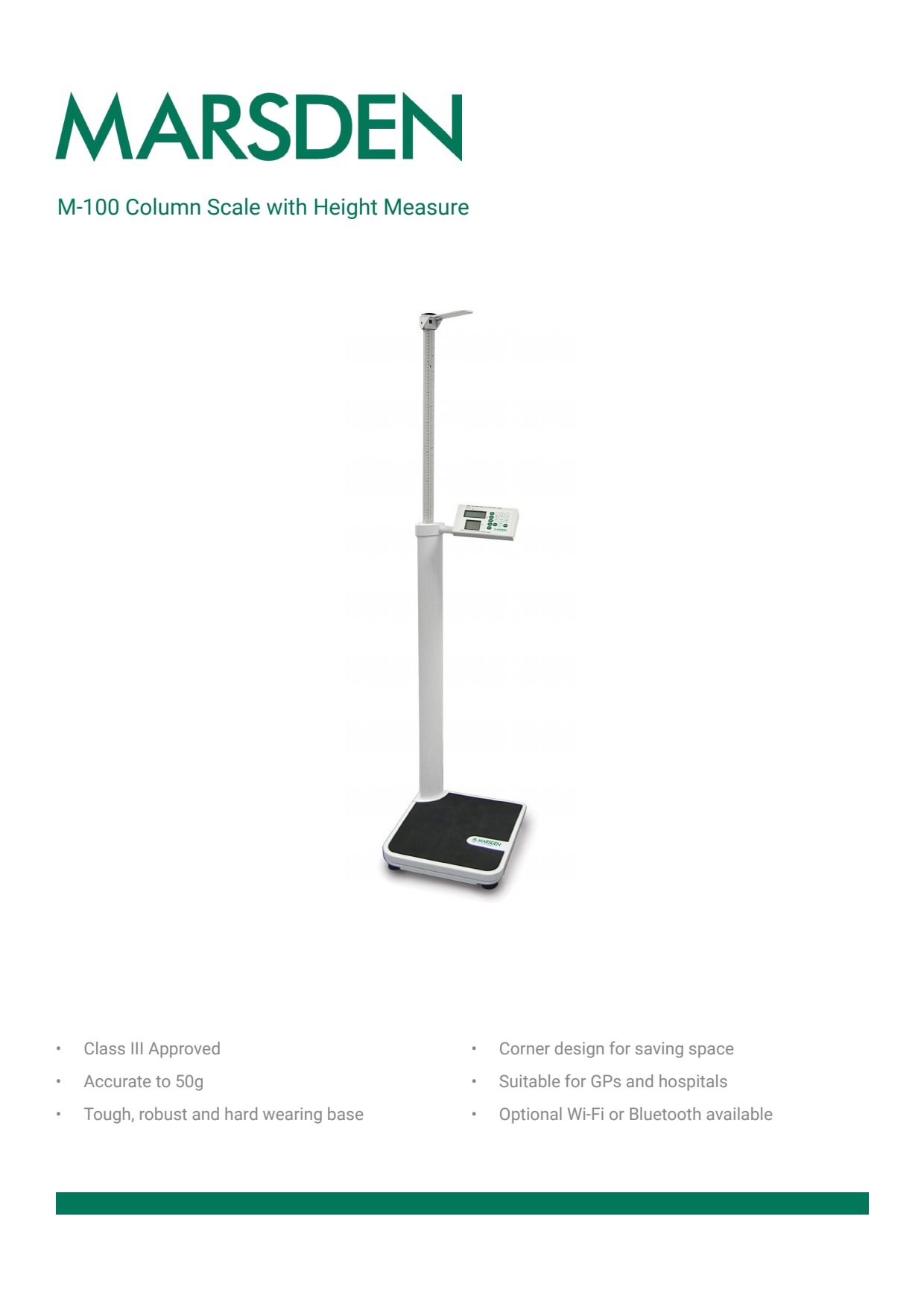 The Marsden M-100 is premium-quality Class III Approved column scale, with a 300kg capacity and 50g accuracy. It has easy to use functions and an integrated height measure, making it a complete measuring solution. The M-100 helps save space, because its unique design means it can be positioned in the corner of a room. It also has a wide weighing area that makes patients feel more stable. This model has no connectivity and is supplied with a standard height measure.