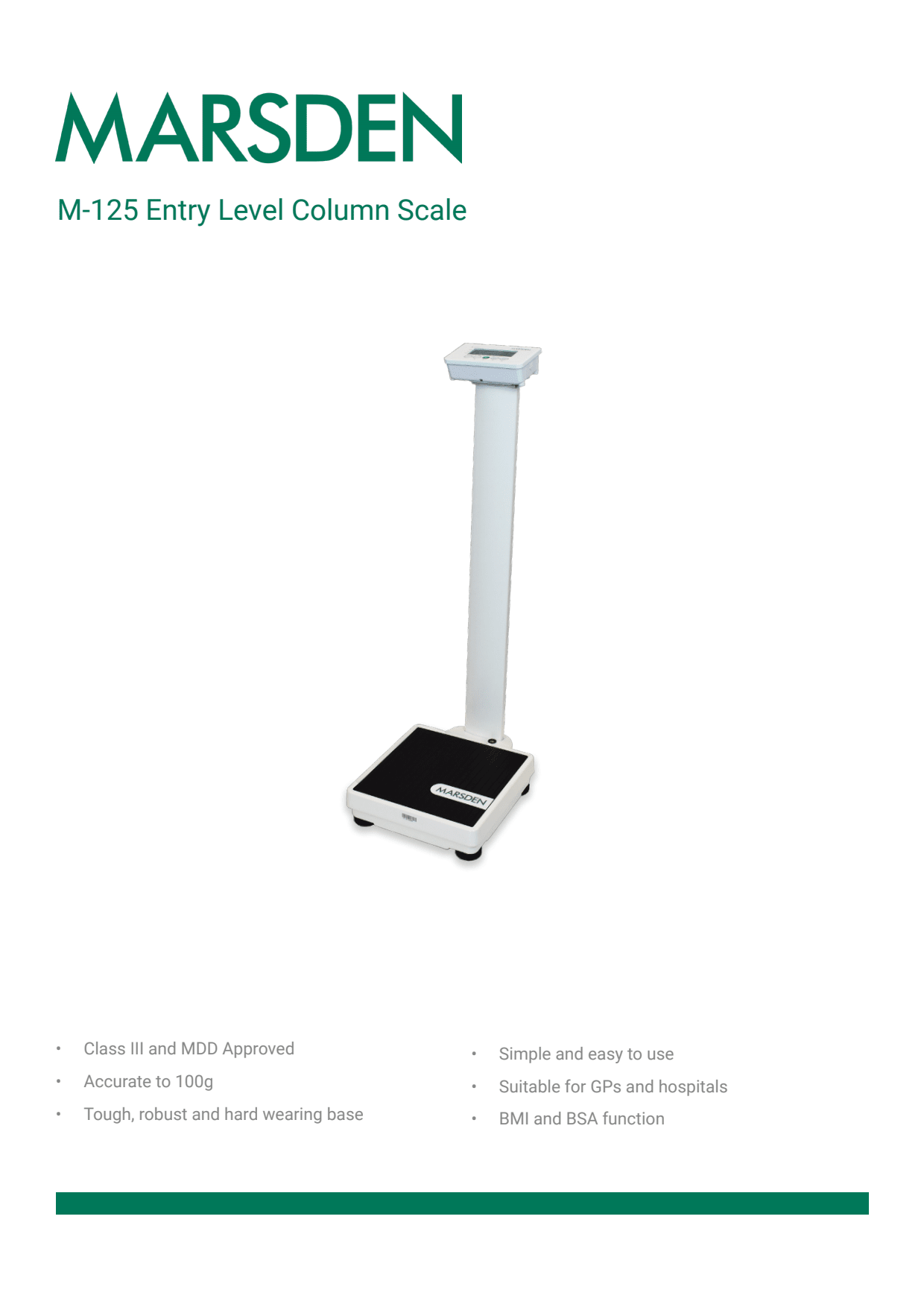 The Marsden M-125 is an entry level Class III Approved column scales. It features a completely redesigned, easy to use indicator, a 250kg capacity and weight readings to the nearest 100g. The scales can calculate BMI and BSA.