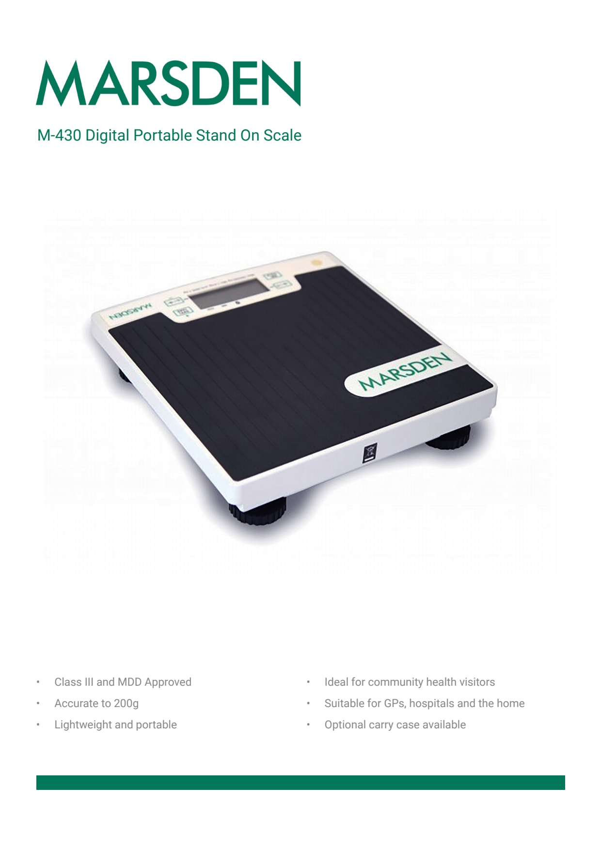 The Marsden M-430 is a lightweight, portable adult floor scale. Is one of the most robust portable medical scales available, and is Class III Approved and MDD Approved. An optional carry case is also available
