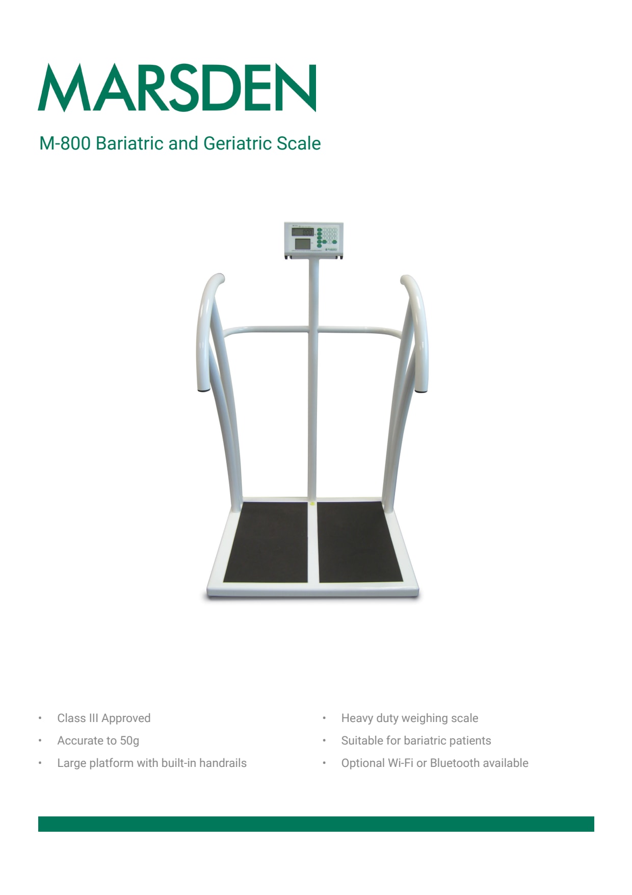 The Marsden M-800 Bariatric Scale is a high capacity, Class III Approved medical weighing scale with sturdy handrails and a large, flat base. Designed for bariatric and geriatric patients, this scale makes getting a weight reading easy and effortless.