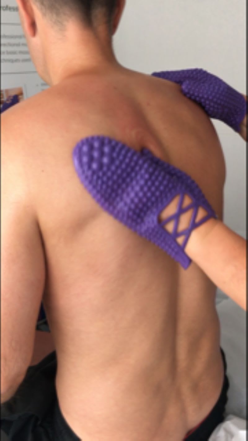 Using the massage mitts will effectively and more comfortably breakdown any muscle tightness and facial tension between the soft tissue layers.