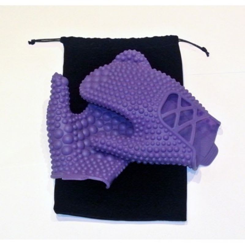 The Professional Massage Mitt come as a pair of mitts, the two Mitts (Left and Right hand) are manufactured from Medical Grade Silicone and come in a stylish black velvet like bag which are then placed inside a box.